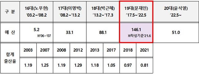 역대 정부의 저출산 관련 예산 및 합계출산율 현황 (단위 : 조원, 출처:보건복지부)
