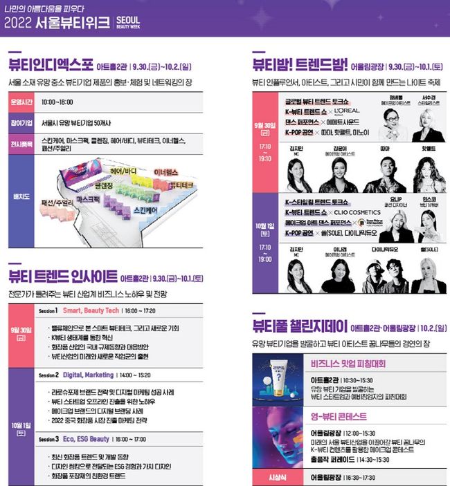 10월 2일(일)에는 ▲혁신 아이디어를 발굴해 5개 대기업과의 협업 기회를 제공하는 ‘비즈니스 밋업(설명회) 피칭대회’와 ▲만 18세 이하 메이크업 꿈나무 선발대회인 ‘영뷰티콘테스트’가 개최된다.