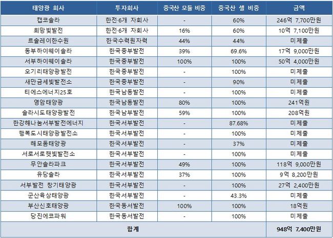 국민의힘 박수영 국회의원(부산 남구갑)이 한전과 6개 발전자회사가 제출한 자료를 종합한 결과, 이들이 투자한 태양광 사업별로 모듈과 셀의 비중은 최대 100%에서 최소 16%까지 중국산이었다. 비용은 최소 950억원에 달한다.