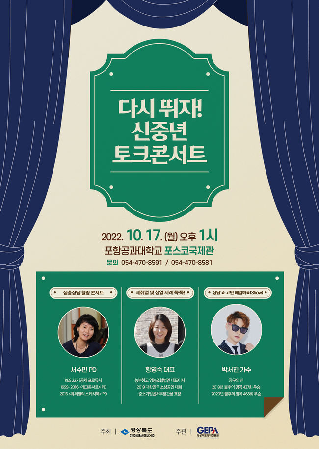 이번 토크콘서트는 경북 동부권 철강산업의 위기로 인한 노동환경 변화 및 경기침체의 장기화에 따라 고용 위기를 겪고 있는 신중년층에게 취・창업 의지를 북돋우기 위해 마련했다.