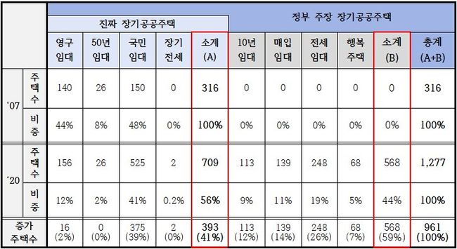 2020년 LH 공공주택 재고량은 127.7만호로 증가했다. 하지만 이중 진짜 장기공공주택 재고는 70.9만호로 2007년 이후 39.3만호 증가에 그쳤다. 반면 2007년 한 채도 없던 10년·매입·행복주택 등은 2020년까지 56.8만호가 늘어난 것으로 나타났다. 공공주택 중 국민임대 등 진짜 장기공공주택 비중은 56%로 2007년의 절반 수준에 그쳤다.