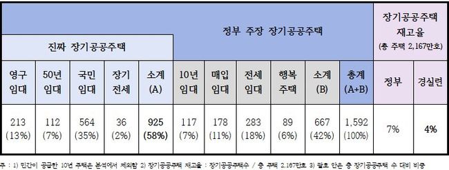경실련은 정부가 주장하는 10년·매입·전세임대, 행복주택 등도 장기공공주택으로 포함하여 계산한다면 LH 보유 127.7만호, 지자체 보유 31.3만호 등 총 159만호가 되며, 장기공공주택 비율도 OECD 평균인 7% 수준이 된다. 하지만 이중 66.7만호는 가짜임대·나쁜임대 주택으로 정부가 거짓된 통계를 제시하고 이를 기준으로 공공주택정책을 추진하니 주거안정효과를 기대할 수 없다고 주장했다.