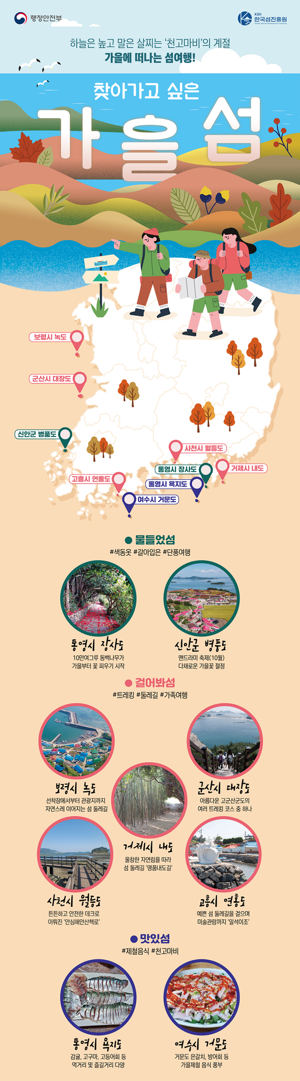 [일간환경연합 장민주 기자]다음은 가을에 떠나는 섬여행! 행안부가 선정한 찿아가고 싶은 가을 섬 9곳을 소개하겠습니다.한눈에 만나 보세요.