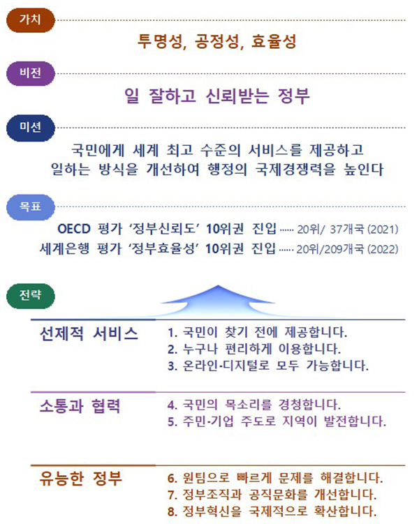 이번 방안은 ‘일 잘하고 신뢰받는 정부’ 구현이라는 비전 아래 ‘국민에게 세계 최고 수준의 서비스를 제공하고 일하는 방식을 개선해 행정의 국제경쟁력을 높인다’는 추진방향으로 설정했다.