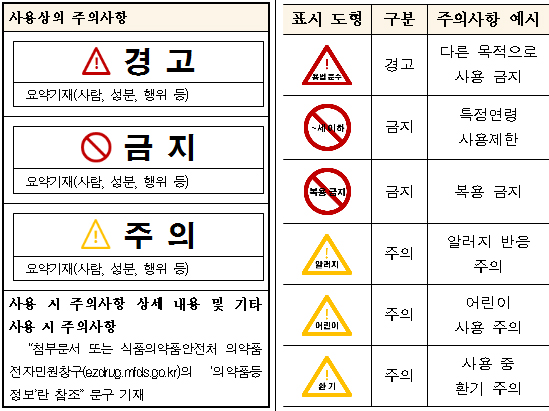 이에 따라 제품의 용기나 포장에 ‘사용상의 주의사항’을 요약해서 기재하는 경우 경고·금지·주의사항 항목을 도안을 활용할 수 있게 된다.