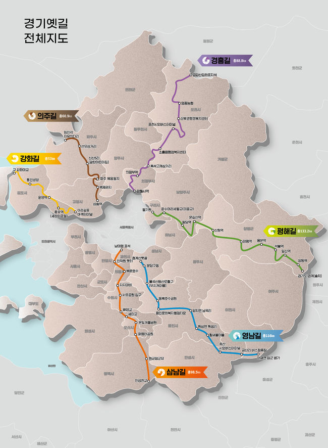 경기도와 경기문화재단(경기옛길센터)은 2013년 삼남길(과천~평택·98.5㎞)과 의주길(고양~파주·60.9㎞)을 복원했으며, 2015년 영남길(성남~이천·116㎞), 2020년 평해길(구리~양평·133.2㎞), 2021년 경흥길(의정부~포천‧88.8㎞) 등을 차례로 복원했다.