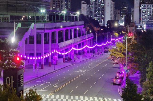<보라로드>는 10월 13일부터 17일(18:05 ~ 익일 06:00)까지 BTS 콘서트가 열리는 본공연장 주변 도로에 보라색 등 600개를 점등하는 행사다.