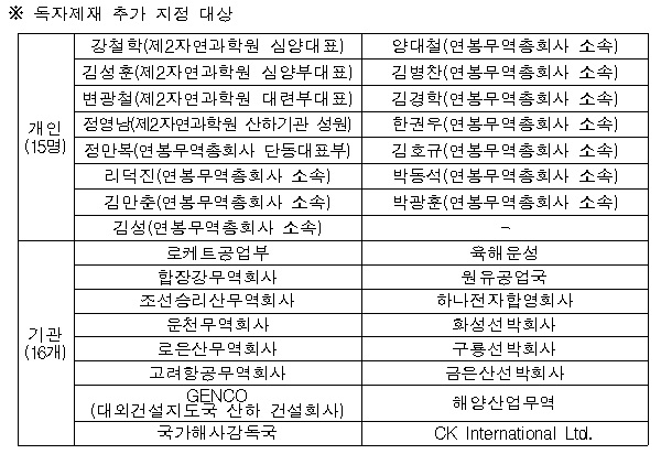 이번 제재 대상으로 지정되는 개인 15명은 유엔 안보리 대북제재 대상인 제2자연과학원 및 연봉무역총회사 소속이다. 이들은 북한의 대량살상무기(WMD) 및 미사일 개발을 위한 자금 조달과 관련 물자의 대북 반입 등에 관여했다고 정부는 밝혔다.