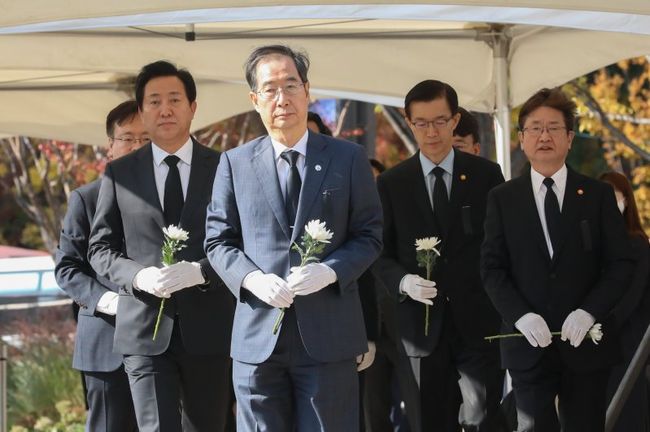 한덕수 국무총리가 31일 서울시청 광장에 마련된 이태원 사고 정부합동분향소를 방문, 조문을 하고 있다.