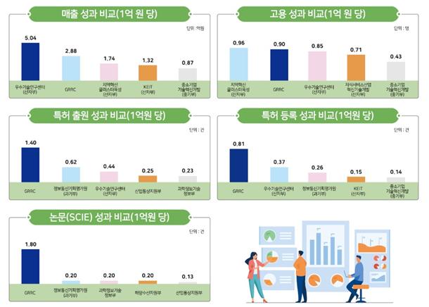 아울러 지역협력연구센터의 성과를 객관적으로 파악하기 위해 타 중앙부처 연구개발 사업과 비교·분석한 결과, 특허 출원·등록과 논문은 가장 많았으며 매출·고용성과는 산업통상자원부 연구개발 사업에 이어 두 번째로 높은 것으로 나타났다.
