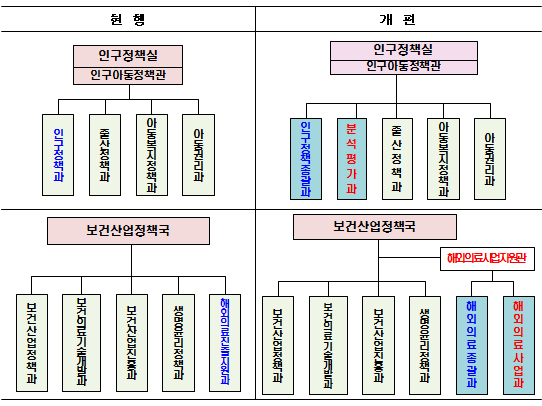 기존의 보건산업정책국 산하의 해외의료진출지원과는 ‘해외의료총괄과’로 변경되고 의료 해외진출 및 외국인환자에 유치에 관한 사항과 중동·유럽·아프리카 지역에 대한 관련 업무를 수행하게 된다.