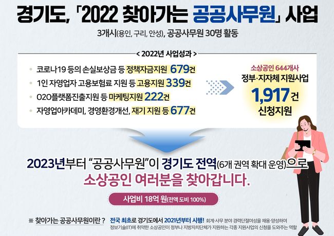 [일간환경연합 김경훈 기자] 경기도가 올해 ‘찾아가는 공공사무원’ 사업을 운영, 3고(高, 고유가·고물가·고금리)로 고통받는 도내 소상공인의 어려운 경영 여건을 타개하는 데 이바지했다고 4일 밝혔다.