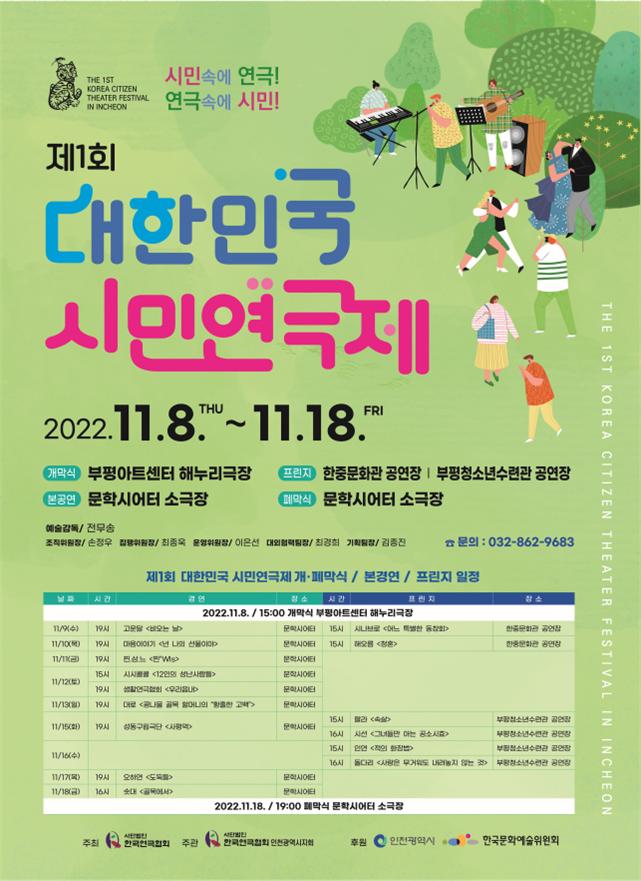 [일간환경연합 한선미 기자] 인천광역시가 후원하고 한국연극협회 인천시지회(이하 인천연극협회)가 주관하는 `제1회 대한민국 시민연극제`가 11월 8일부터 18일까지 인천시 일대에서 개최된다고 밝혔다.