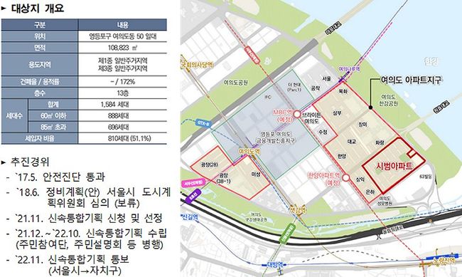 여의도 시범아파트(10만 8,800㎡, 1,584세대)는 1971년 준공돼 50년이 넘은 여의도에서 가장 오래된 단지다. 오랜 기간 재건축을 준비해왔지만, 지난 2018년 ‘여의도 통개발(마스터플랜)’ 논란에 가로막혀 사업 추진이 보류된 바 있다.