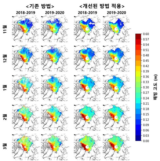 2018.11.~2020.03. 중 겨울철 북극 해빙 월평균 고도 (해수면 위에 노출된 부분) 비교 <기존방법> 인공위성 고도계를 통해 측정한 자료는 구름 등으로 관측이 어려운 공간이 발생, 두께도 고도계가 있는 인공위성과 직접 수직으로 만나는 지점만 추정 가능하며, 고도계 관측은 관측 공백 시기가 다수 존재 <개선된 방법> 수면 위 해빙의 높이는 대체로 유사하게 나타났으며 고도계의 관측 공백을 채울 수 있을 뿐만 아니라 과거 20년간의 장기간 해빙 두께 추정 가능