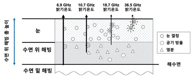 수동 마이크로파 해빙 투과ㆍ산란 모식도 (위 그림은 같은 두께의 해빙에서 주파수별 밝기온도(인공위성의 관측 신호를 온도 단위로 변환한 수치)를 나타내며, 해빙은 밝기온도가 높을수록 산란정도(파장이 퍼지는 정도)가 큰 특성을 가짐. 따라서 특정 주파수에서 관측한 밝기온도를 통해 산란정도를 알 수 있음)
