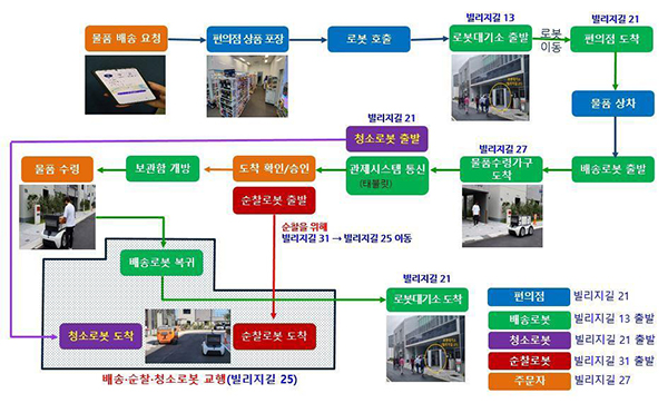▲ ‘배송요청→물품상차→로봇 배송→도착문자→물품하차’ 등 로봇 배송 시연 진행 절차행안부는 이번 시연을 통해 아기 돌봄 등으로 집을 비우기 어려운 가정이나 전염병 확산 등으로 비대면을 요구하게 되는 경우에도 효과적으로 배송서비스를 제공할 수 있을 것으로 기대한다고 밝혔다.