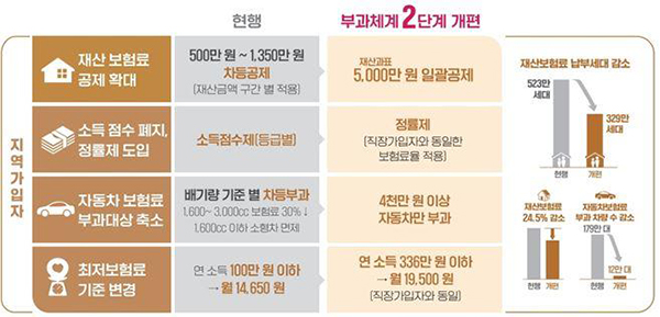지난 9월 1일부터는 소득 중심 부과체계 2단계 개편을 시행해 건강보험 지역가입자의 월평균 보험료를 3만 6000원 낮췄고, 보수 외 소득 부과 기준 및 피부양자 소득 기준은 강화했다.