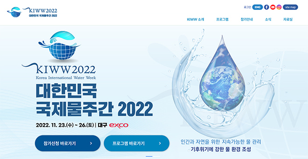 ▲ 대한민국 국제 물주간 2022 누리집 메인화면.국제물주간은 우리나라의 물 분야에 대한 국제적인 위상을 높이고 국내 물산업의 해외진출을 지원하기 위해 2016년부터 해마다 여는 국내 최대 규모 물 분야 행사다. 코로나19로 인해 3년 만에 열린다.