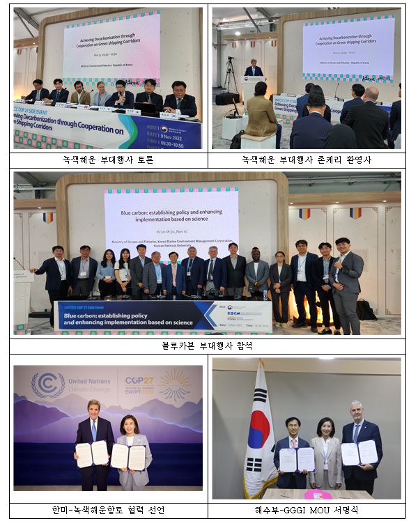 ▲ COP27 참석 현장. (사진=해양수산부)해수부는 또 한국과 인도네시아, GGGI가 참석한 블루카본 관련 토론회를 8일 개최해 한국 해양수산부문 저탄소·무탄소 선박개발 기술 등 기후변화대응 정책을 소개했다.
