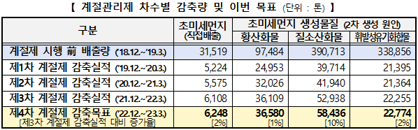 이번 계절관리제 시행계획은 지난 제3차 계절관리제 기간(2021년 12월∼2022년 3월) 감축 실적보다 초미세먼지와 생성물질을 최대 10% 더 감축하는 것을 목표로 설정했다.