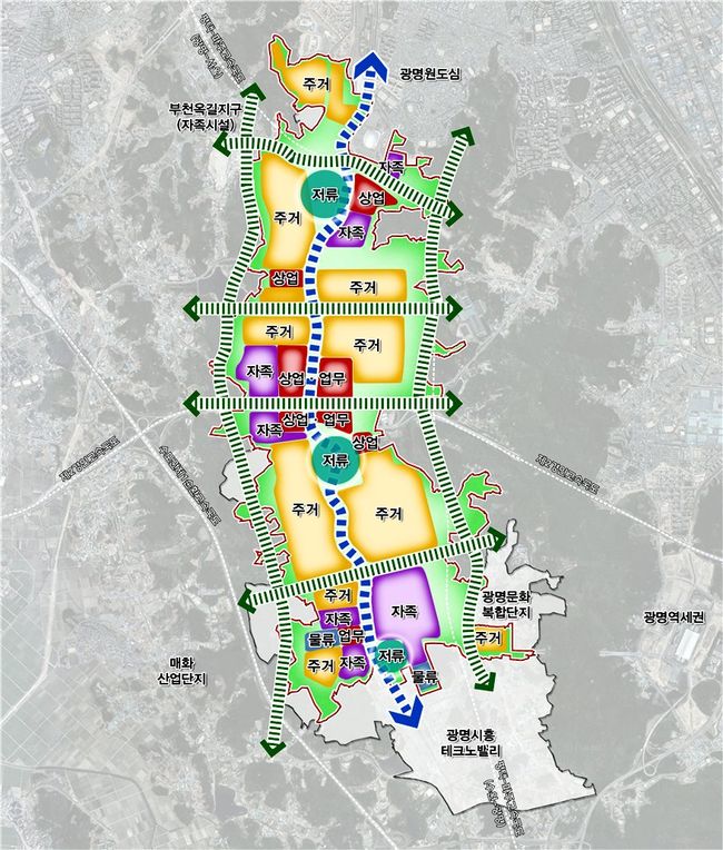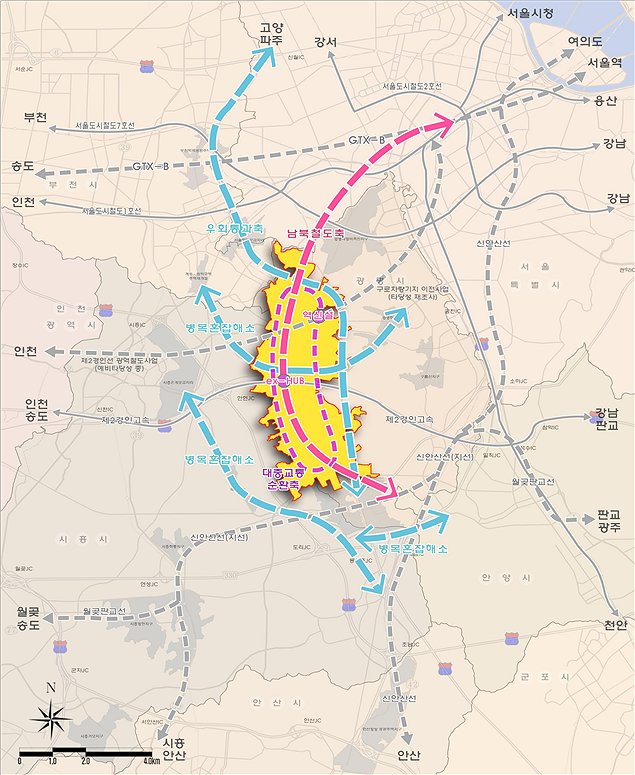 서울 도심으로 20분대 진입이 가능하도록 광명시흥을 가로지르는 도시철도를 신설하여 GTX-B(신도림역, ’30년 개통 예정)와 연결하는 철도중심의 대중교통 체계를 구축할 예정이다.