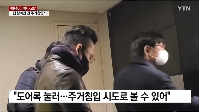 더탐사 취재진이 한동훈 법무부 장관의 동의 없이 한 장관의 자택 문 앞까지 찾아갔다가 공동주거침입 혐의로 고발됐다. (사진은 고발 사건을 전하고 있는 YTN 화면)