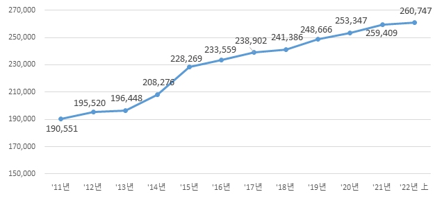 국토교통부는 `22년 상반기 기준 외국인이 보유한 국내 토지면적이 `21년 말 대비 0.5%(1,338천㎡) 증가한 260,747천㎡으로, 전체 국토면적(100,431,849천㎡)의 0.26% 수준이라고 밝혔다.