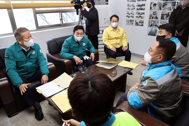 [일간환경연합 장민주 기자] 원희룡 국토교통부 장관과 이상민 행정안전부 장관은 12월 1일 14시 30분 인천광역시 소재의 한 시멘트 유통기지를 방문, 시멘트 출하 현장을 확인하고 업계 동향과 애로사항을 청취하였으며 출하 현장을 지원하는 경찰관들을 격려하였다.