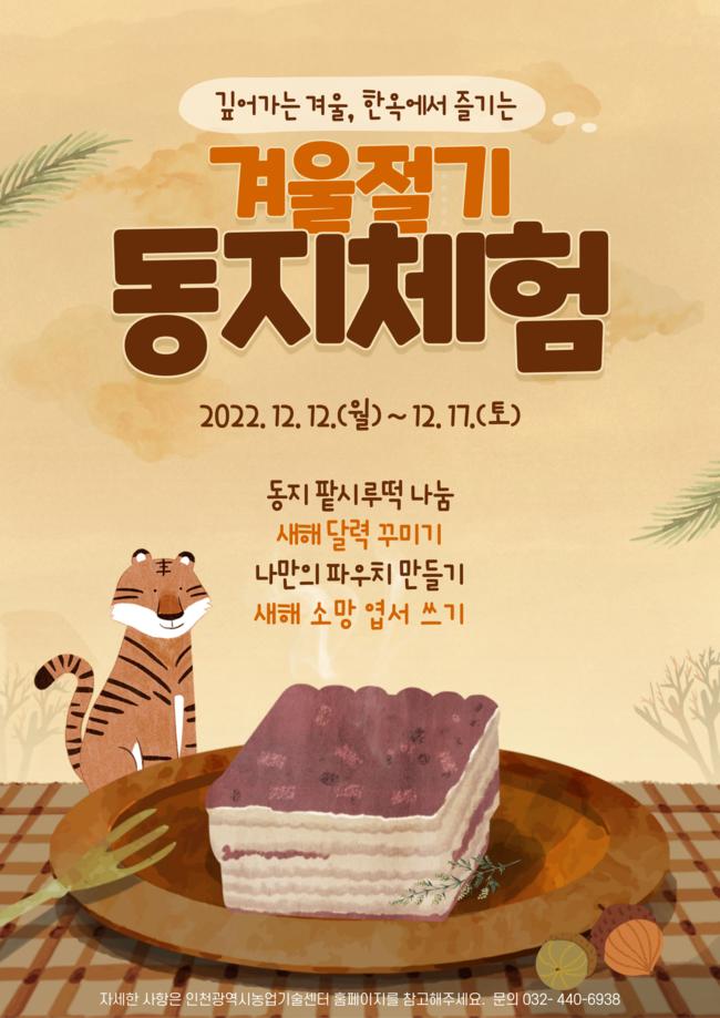 체험은 농업기술센터 전통문화체험교육관「인희재」에서 진행되며, 동지풍습인 동지첨치(동지 팥시루떡 나눔), 동지책력(새해 달력 꾸미기) 등을 체험해 볼 수 있다.
