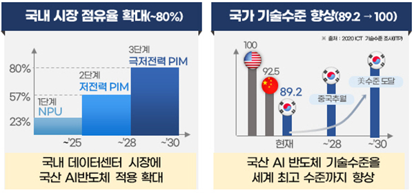 2단계(2026∼2028)에서는 DRAM 기반 상용 PIM(Processing in Memory, 메모리에 프로세서 기능을 추가하여 고성능·저전력 구현)과 국산 NPU를 접합해 글로벌 수준의 연산 성능을 저전력으로 구현(DRAM 기반 PIM)한다.