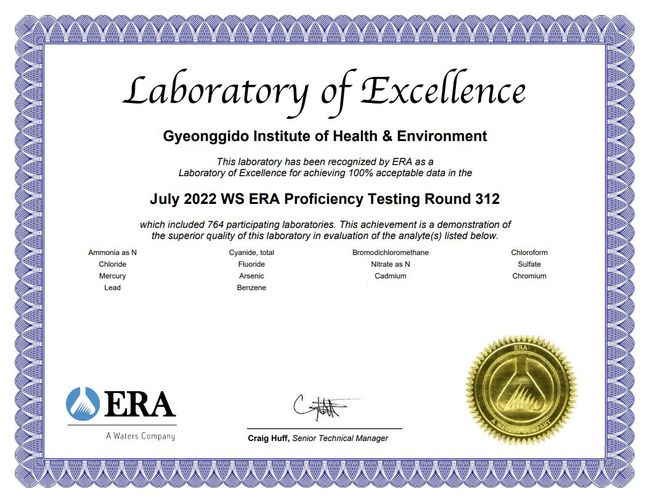 [일간환경연합 김경훈 기자] 경기도보건환경연구원은 먹는물 분야 국제숙련도 시험에서 7년 연속 우수 분석기관(Laboratory of Excellence) 인증을 받았다고 13일 밝혔다.