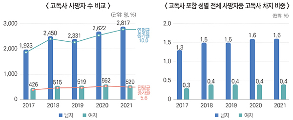 고독사를 포함한 성별 전체 사망자 중 고독사가 차지하는 비중은 남성 1.3∼1.6%와 여성 0.3∼0.4%로, 모든 지표에서 남성이 여성에 비해 고독사에 취약한 것으로 확인됐다.