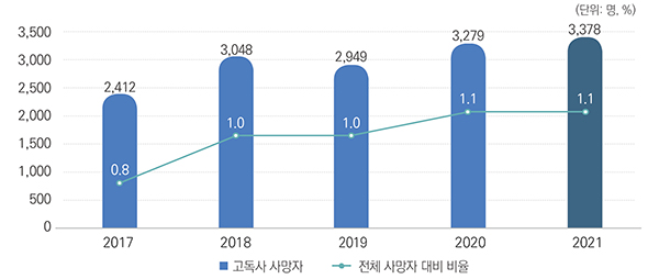 고독사 중 자살 사망 비중은 16.5∼19.5%이며 연령이 어릴수록 자살로 인한 고독사가 많았다.