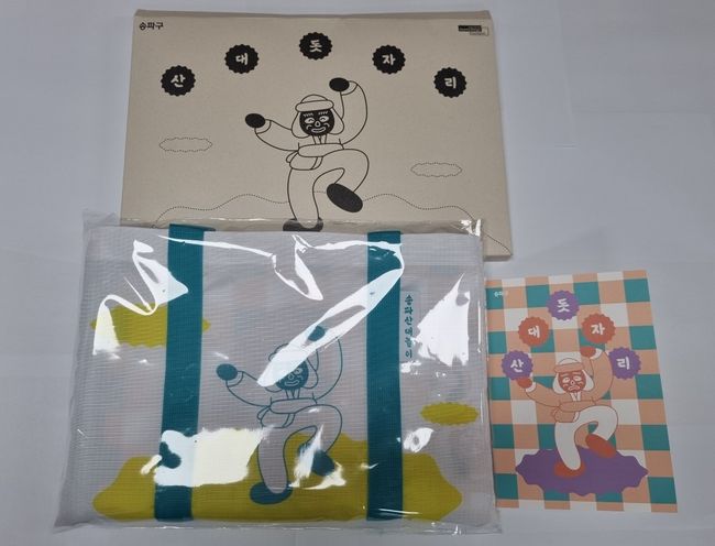 ▲송파산대놀이 돗자리, 가방 세트는 조선시대 민중의 놀이문화와 현대 여가생활을 접목해 우리의 소중한 문화와 역사를 전승하기 위한 목적으로 제작됐다. 산대놀이가 익숙하지 않은 이들을 고려해 송파산대놀이 캐릭터를 귀엽게 각색해 넣었으며 각 인물들의 특색을 살려 차별성을 두었다. 또한 삼현 육각 악사 캐릭터, 고사상에 올라가는 북어를 들고 있는 돼지머리 캐릭터, 산대놀이 내 길놀이 령(令) 깃발 등으로 재미를 더했다.