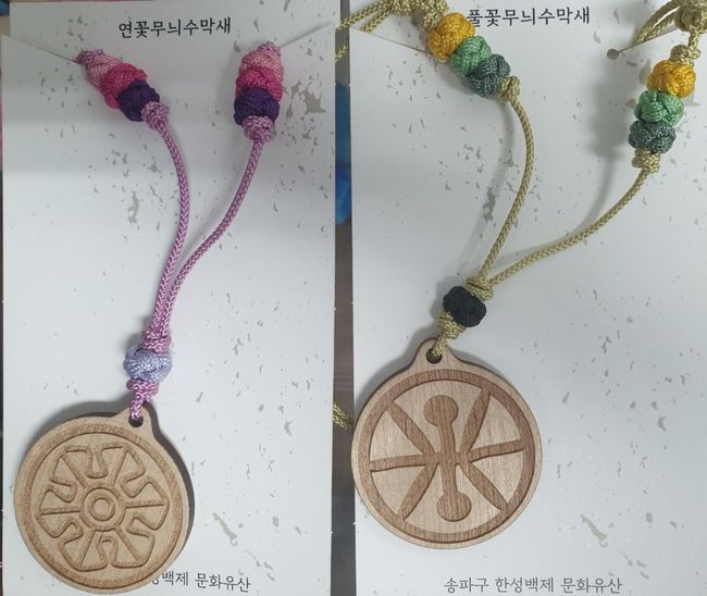 ▲칠지도‧수막새 문양 펜던트는 칠지도, 연꽃‧풀꽃 무늬 등 전통문양을 새긴 나무 펜던트에 ‘송파전래놀이 지도자회’에서 손수 제작한 전통매듭을 연결했다. 나뭇결로 새긴 문양의 멋스러움과 매듭의 예스러움이 두드러진다.