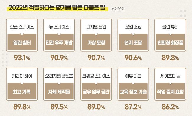 ‘열린 쉼터’ 외에도 응답자의 90% 이상이 ‘민간 우주 개발’(뉴 스페이스: 민간이 주도하는 우주 개발), ‘가상 모형’(디지털 트윈: 가상 공간에 실물과 똑같이 만든 물체, 또는 그러한 것을 만드는 기술), ‘현지 조달’(로컬 소싱: 상품을 제작하거나 생산할 때 국내에서 만들어진 물자를 활용하는 전략)을 적절하게 다듬은 말로 평가했다.
