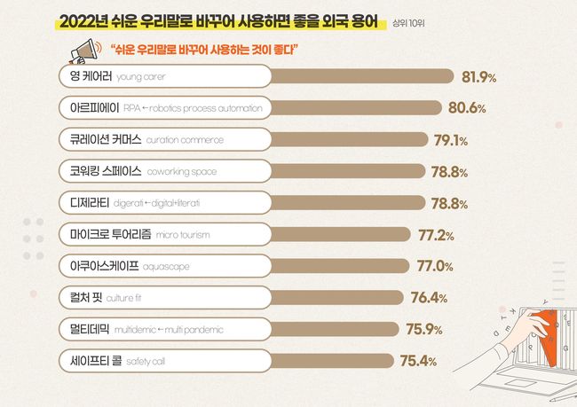 다음으로 ‘큐레이션 커머스(79.1%, 다듬은 말: 소비자 맞춤 상거래)’, ‘코워킹 스페이스(78.8%, 다듬은 말: 공유 업무 공간)’, ‘디제라티(78.8% 다듬은 말: 디지털 지식인)’ 등을 쉬운 우리말로 바꿔야 할 외국 용어로 보았다.