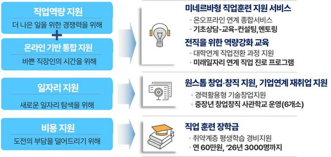 또한, 전직‧이직에 필요한 자격증‧학점 취득을 위한 대학 연계 프로그램을 확대한다. 누구나 공평한 교육을 받을 수 있도록 취약계층에는 직업훈련 장학금(연 60만 원)을 지원한다.