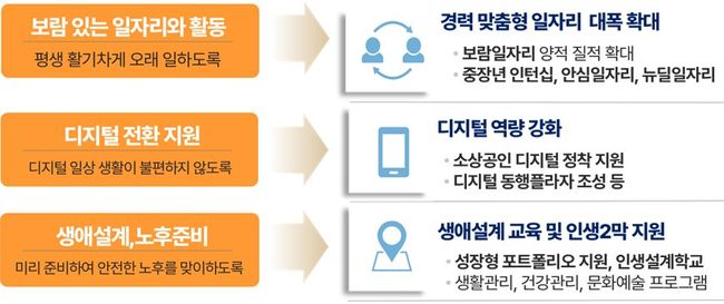 안정된 일자리와 자기개발에 대한 욕구가 큰 40대는 더 나은 일자리로 업그레이드할 수 있도록 ‘취업‧창업 역량 강화’를 집중 지원한다. 퇴직 후에도 사회활동을 계속하고 싶은 50대에게는 더 오래 일할 수 있도록 디지털 적응력을 높이는 한편, 경제활동을 하면서 사회에도 공헌할 수 있는 일자리를 확대한다. 안전한 노후를 맞을 수 있도록 생애 재설계도 돕는다.