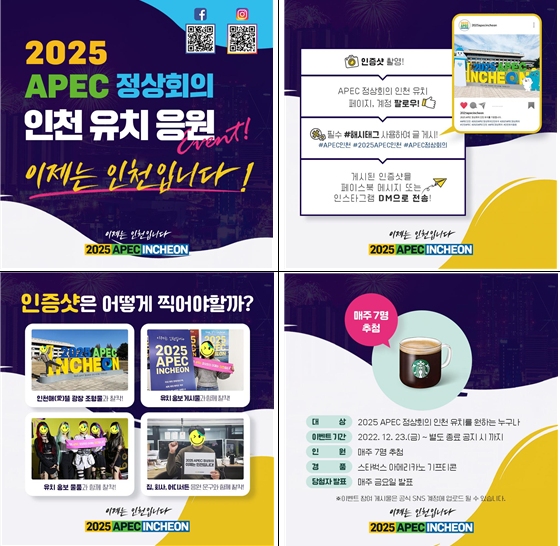 [일간환경연합 김경훈 기자] 인천광역시은 2025년 대한민국에서 개최가 확정된 아시아‧태평양경제협력체(Asia-Pacific Economic Cooperation, APEC) 정상회의의 인천 유치를 위한 공식 소셜 미디어(SNS) 응원 이벤트를 실시한다고 밝혔다.