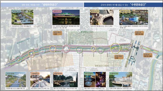 군포시 산본천은 1천916억 원을 들여 복개시설 철거로 치수 안정성 확보와 수질개선을 도모하고, 보행자·자전거도로 등을 확충해 여가 기능을 강화한다. 수도권광역급행철도(GTX) 사업도 연계해 지역경제 활성화를 꾀할 방침이다.