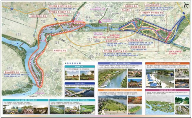 경기도의 3개 사업 주요 내용을 보면 평택시 안성천은 평택시 팽성읍 원정리~유천동 약 8km 구간에 총 853억 원을 투입해 노을생태문화공원을 중심으로 팽성습지공원, 수변 놀이문화공원, 천변 산책로 등 도심과 어우러지는 복합 친수공간을 조성하면서 ‘살아 숨 쉬는 생명 하천’을 구현한다.
