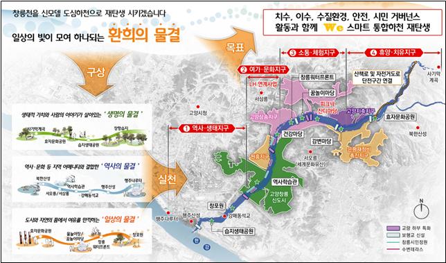 북한산과 한강을 연결하는 고양시 창릉천에는 2천295억 원을 투입해 3기 신도시 등과 연계하면서 역사·문화·자연을 통합한 스마트 통합하천으로 만들 계획이다. 여기에 역사학습관, 꿈놀이마당, 창릉워터프론트 등 시민 활동공간을 확보할 예정이다.