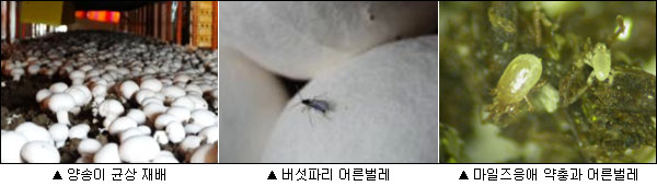 양송이는 무농약 재배가 일반적이지만 버섯파리 밀도가 높을 경우 생산량이 크게 줄어들 수 있다.
