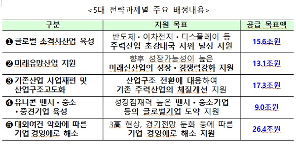 5대 전략과제는 ▲글로벌 초격차 산업 육성(16조원) ▲미래 유망산업 지원(13조원) ▲산업구조고도화(17조원) ▲ 유니콘 육성(9조원) ▲경영애로해소(26조원) 등이다.