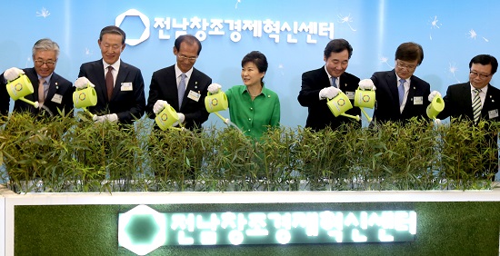 박근혜 대통령과 이낙연 전남지사, 등 참석자들이 2일 전남 여수시 전남창조경제혁신센터에서 열린 개소식에서 물을 주는 퍼포먼스를 하고 있다.