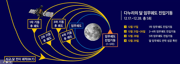 * 당초 : 1차 진입기동(12.17) → 2차 진입기동(12.21) → 3차 진입기동(12.23) → 4차 진입기동(12.26) → 5차 진입기동(12.28) → 달 임무궤도 진입 확인(12.29)