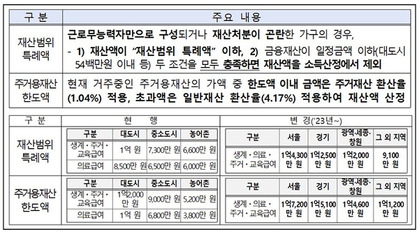 기본재산공제액 기준 변경은 윤석열 정부의 국정과제 중 하나인 국민맞춤형 기초보장 강화 추진의 일환으로, 그동안 주거재산의 가격 상승 등을 반영해 현실에 맞게 지역 구분 및 공제액 기준을 보완하기 위한 취지다.