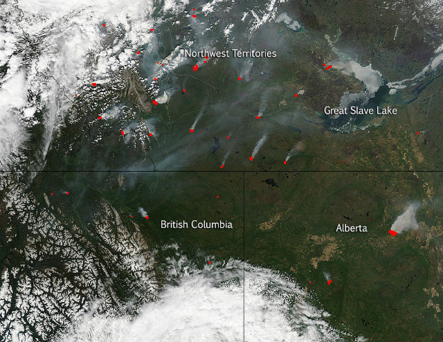 캐나다의 산불센터에 따르면, 2014년 산불의 수는 24022 헥타르(59360 에이커)의 소실이 있었다고 발표를 했고 올해의 화재는 이미 239315 헥타르 (591360 에이커 924 평방 마일)를 소실시켰다. 즉 전년도에 비해 올해 6월이니까 벌써 10배 정도의 소실이 있다는 결론이다.